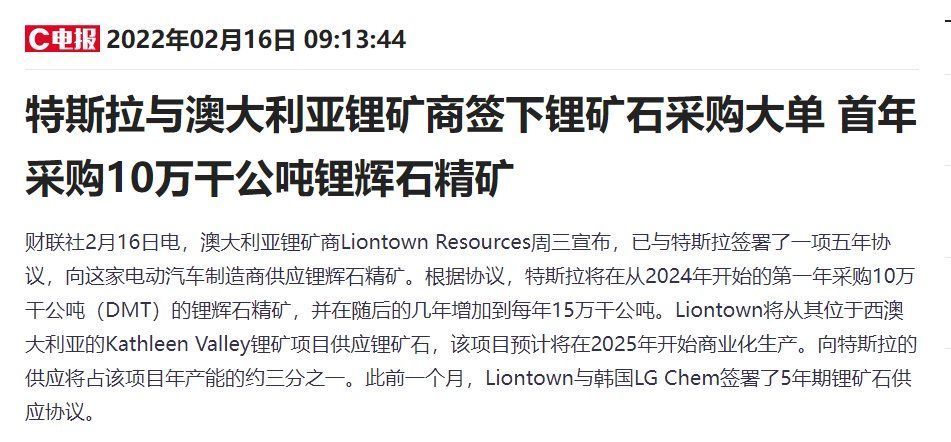 2021年,A股年内最强新能源主线始于锂资源供需紧张,从新能车行情起飞至退潮,锂矿及衍生品价格一直水涨船高,锂资源成为新能车产业链下游企业的兵家必争之地,宁德时代、紫金矿业斥巨资竞购加拿大锂盐商;周三,特斯拉与澳大利亚锂矿商新签下锂矿石采购大单,自2024年起将逐步从Liontown Resources采购10万千公吨(DMT)起的锂精矿。